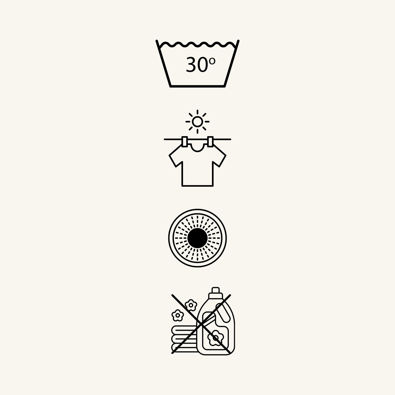 - Avoid softeners & bleach (they weaken fibres and prints).